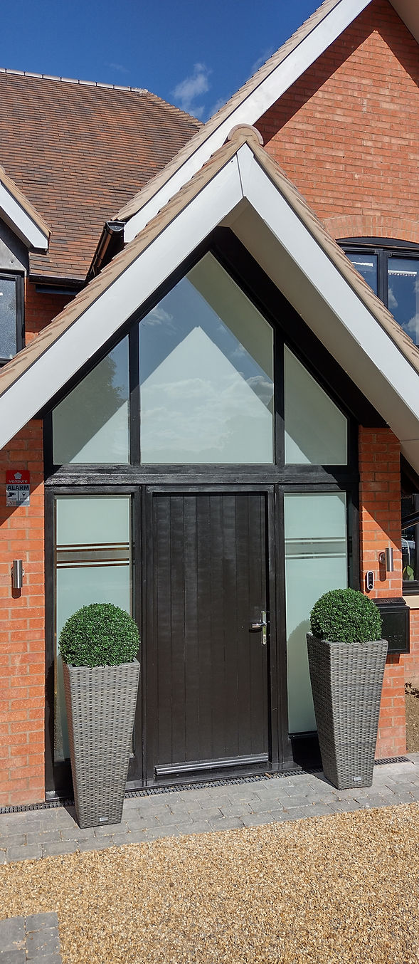 Frosted obscure film with contrasting frosted strip applied to an entrance porch to provide privacy.